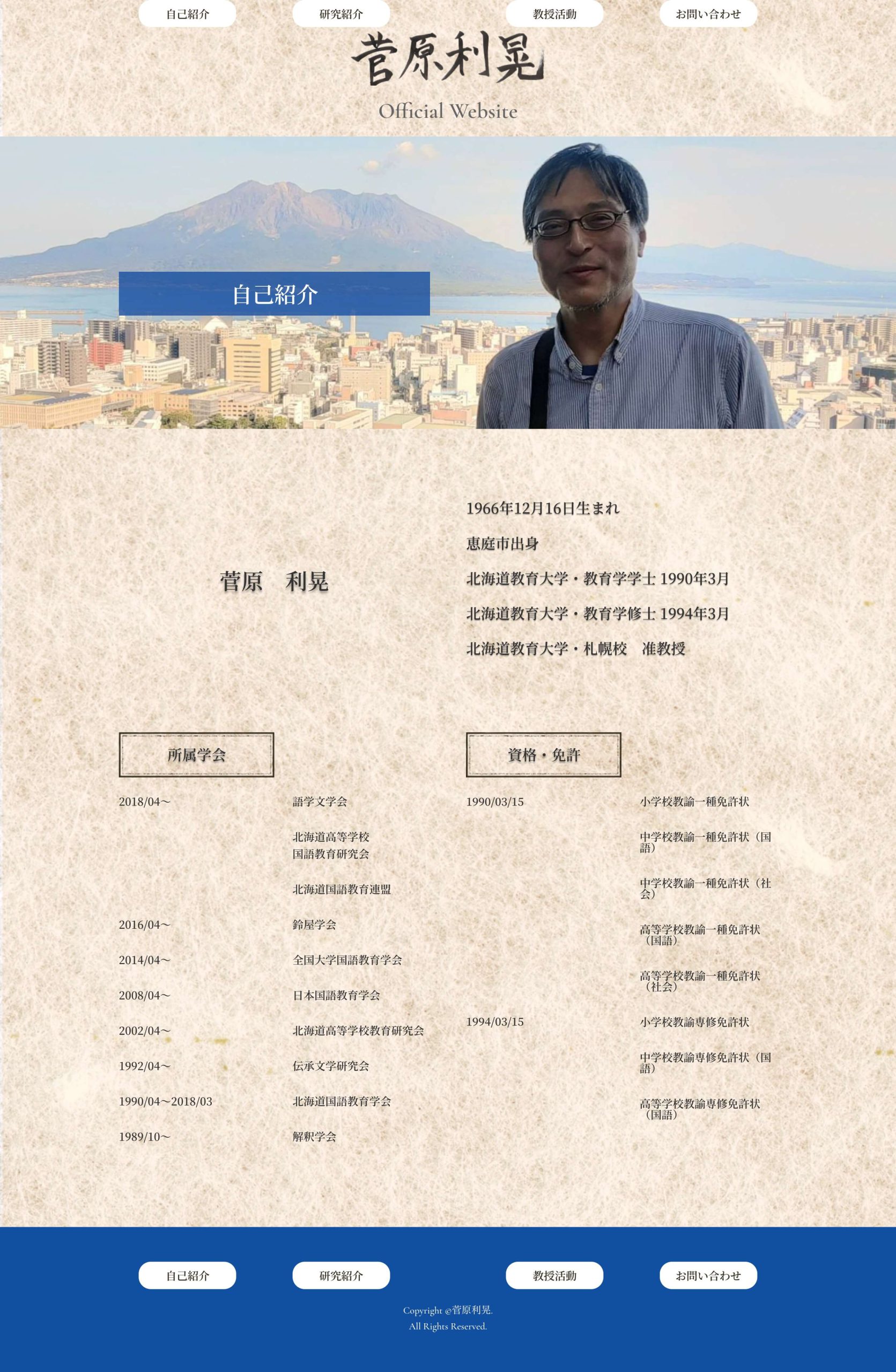 A website serving as a portfolio for Professor Toshiaki S., listing and summarizing his experiences and achievements throughout his career. The site is designed to serve as a web-based alternative to a business card, presenting a comprehensive overview of his professional journey.